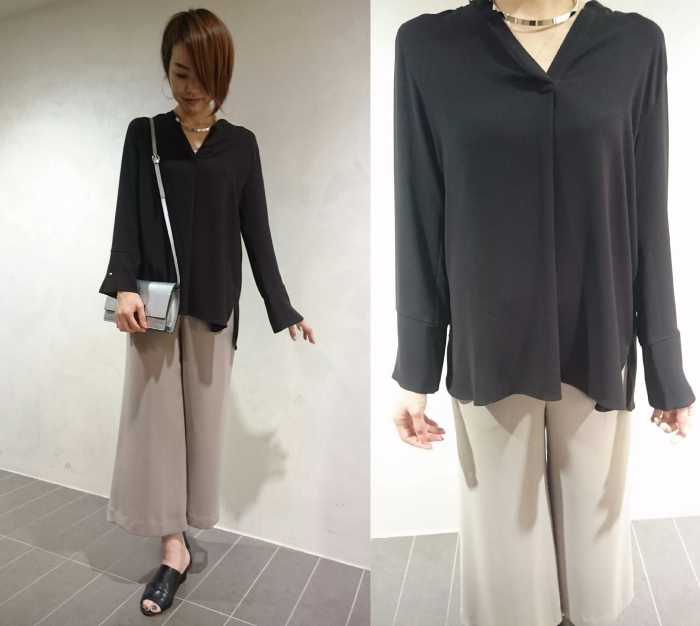 襟のラインのすっきりとしたブラウスはブラックでも重たくなりません。スリットをボタンで留めた長めの袖のカフスがポイントで、コートを脱いでブラウス1枚で着たくなる軽やかさ。ニュアンスのあるカーキ系グレーとブラックの組み合わせは大人っぽくおすすめのコーデです。![]()